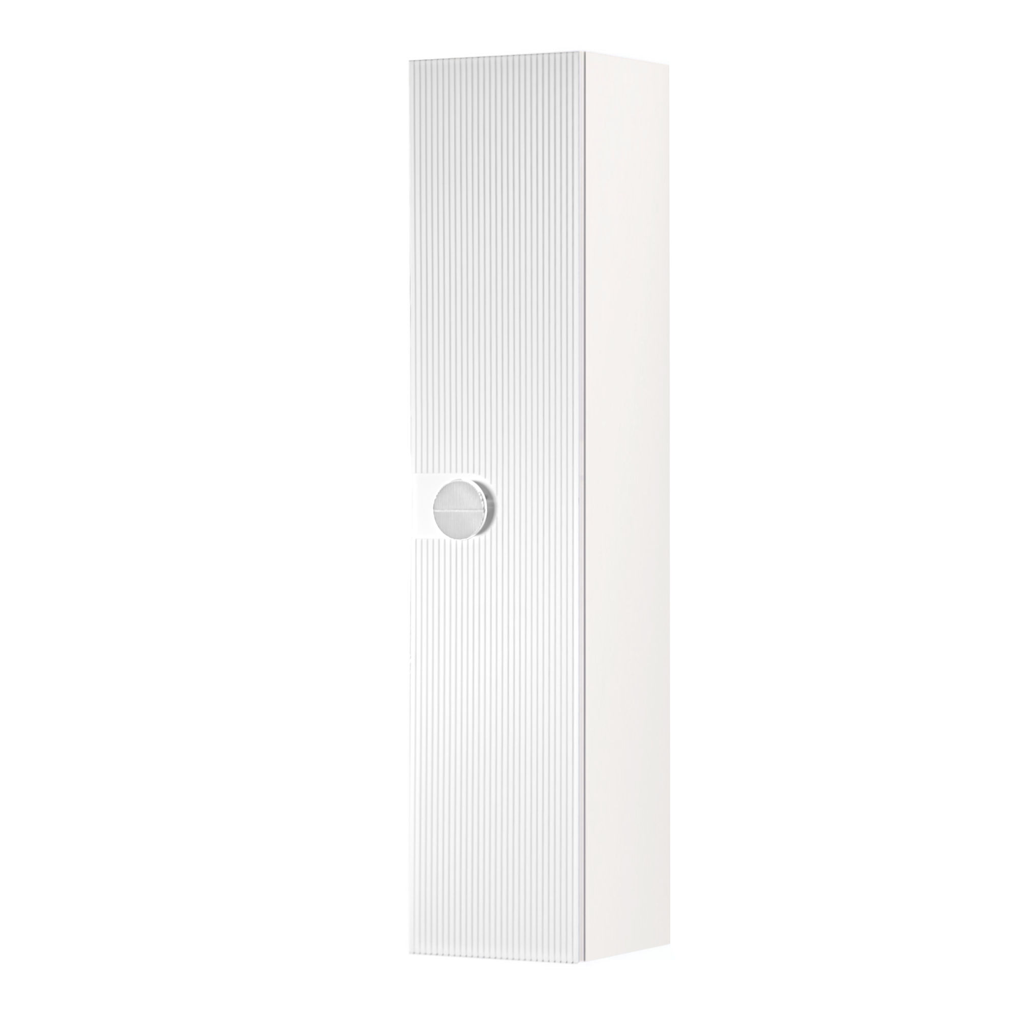 Regał wiszący z frontem ryflowanym o wysokości 160 cm, szerokości 35 cm i głębokości 32 cm z kolekcji Sanitti Epsilon. Regał jest uzupełnieniem kolekcji szafek pod umywalkę i lustra Epsilon.